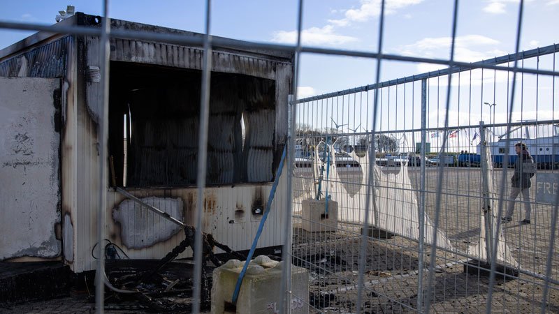 A person walks past a burned-out coronavirus testing facility in the fishing village of Urk in the Netherlands after it was set on fire.