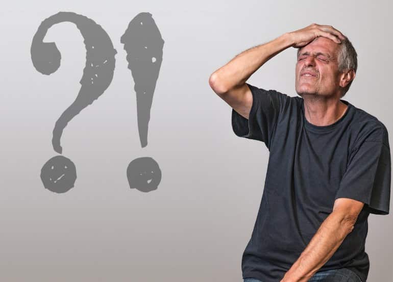 This shows an older man holding his head