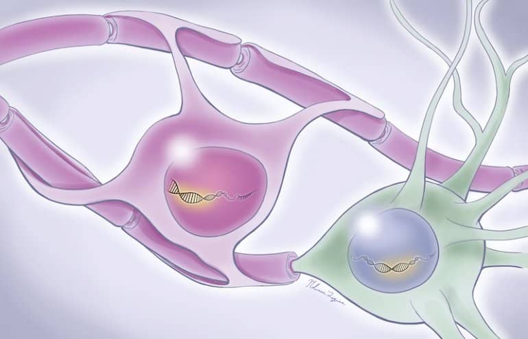 Next, the researchers looked at the activity of these hub genes in separate cell types within the samples. Surprisingly, they found that several of these hubs weren’t active within nerve cells themselves but in a different population of cells known as glia. These cells provide support and protection for nerve cells, including manufacturing the fatty layer that insulates nerve cells so they can efficiently pass electrical signals.