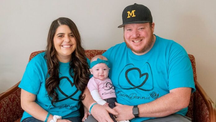 Jackie Dennis, left, and her husband, Ricky Dennis, pose for a photo with their daughter, Mia Rose, at Henry Ford Health System in Detroit.